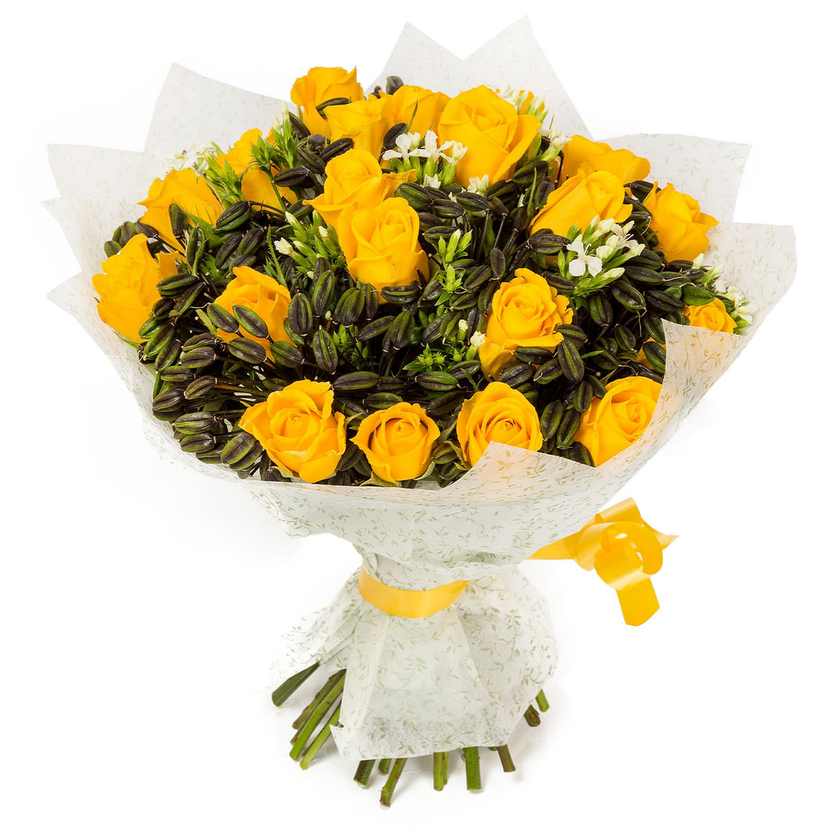 Роза одноголовая жёлтая, зелень. Упаковка (лента, пленка, крафт, сетка, пленка матовая)
