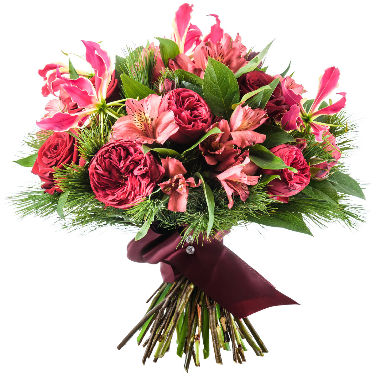 Роза пионовидная одноголовая красная, альстромерия розовая, глориоза, апидистра.Упаковка (лента, пленка, крафт, сетка, пленка матовая)