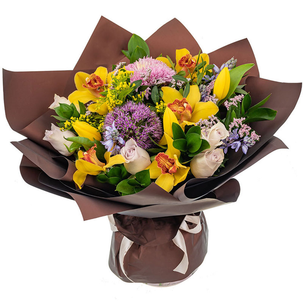Орхидеи желтая, хризантема одноголовая розовая, аллиум, солидаго, тюльпан желтый, роза одноголовая светло-сиреневая, рускус, фисташка, лимониум, кампанула. Упаковка (лента, пленка, крафт, сетка, пленка матовая)