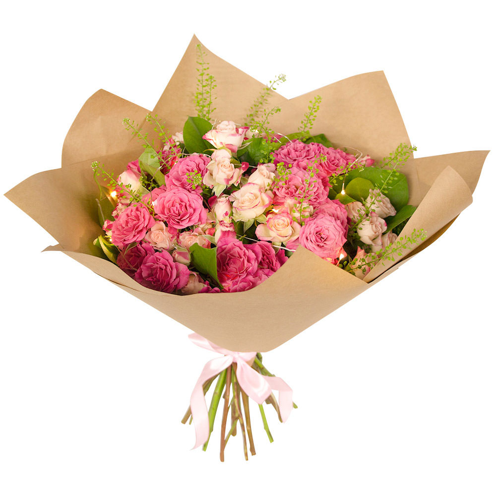 Роза кустовая микс (оттенки розового), зелень. Упаковка (лента, пленка, крафт, сетка, пленка матовая)