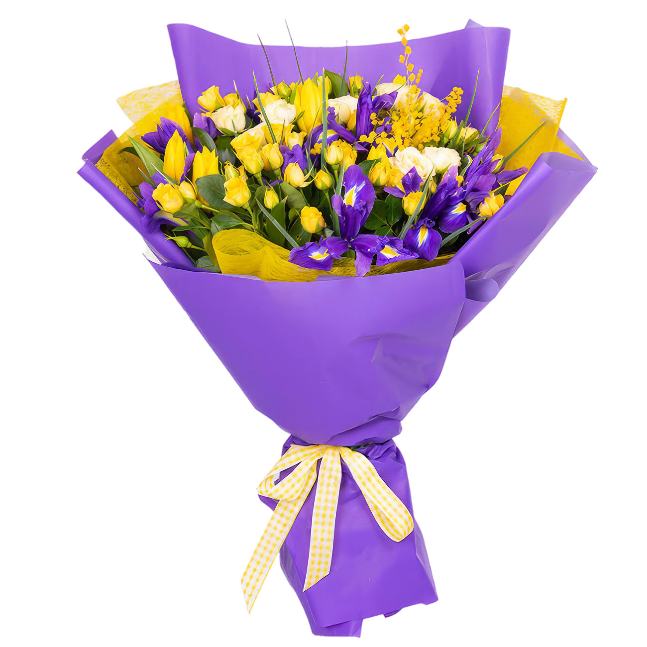 | Состав | Ирисы, Кустовые розы, Мимозы, Розы, Тюльпаны |