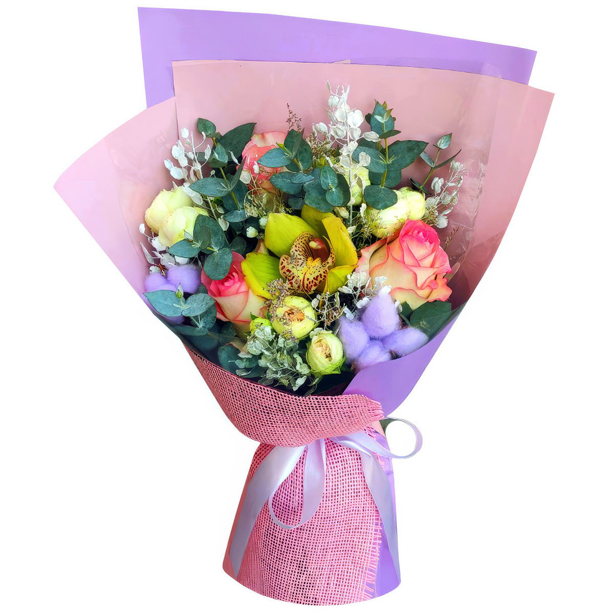 | Состав | Кустовые розы, Орхидеи, Пионовидные розы, Розы, Хлопок, Эвкалипт |