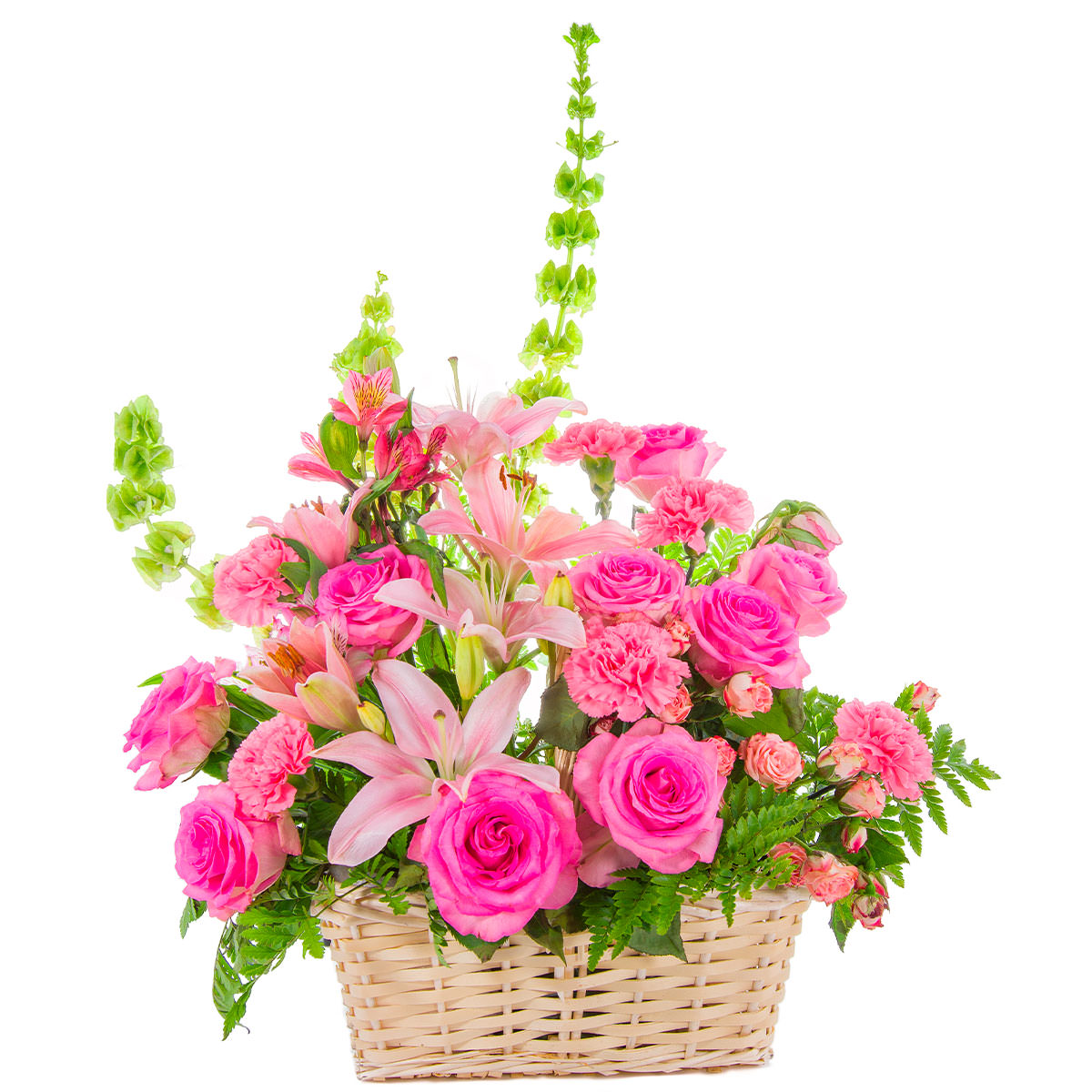 Роза одноголовая розовая, роза кустовая розовая, гвоздика розовая, лилия розовая, альстромерия розовая, Упаковка (Корзина, оазис, ящик).