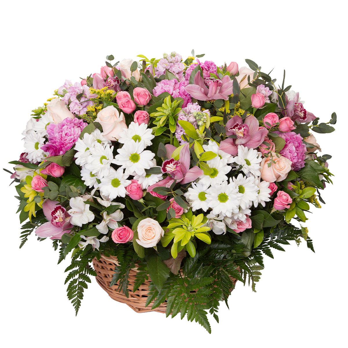 Роза кустовая розовая и белая, орхидея розовая, альстромерия белая, пион розовый, хризантема кустовая белая, солидаго. Упаковка (Корзина, оазис, ящик).